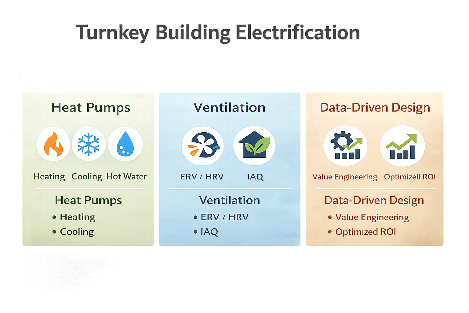 NOVA 1 is a design-build mechanical contractor focused on turnkey building electrification. We deliver high-performance heat pump systems for heating, cooling, and domestic hot water, alongside advanced ventilation solutions. Through data-driven design, value engineering, and deep product expertise, we create innovative, supremely efficient systems that unlock stronger project economics and higher ROI for our clients.